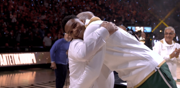 字母哥和字母哥哥都戴上总冠军戒指,在雄鹿总冠军戒指上,刻着球员的名字、球衣号码以及季后赛各轮系列赛的总比分,上面镶着50颗钻石,这款总冠军戒指还可以一分为二变成一个项链;雄鹿正式颁发总决赛戒指,这意味着上赛季正式结束,新赛季正式开始。