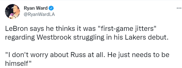 赛后,湖人主帅沃格尔表示威少需要更多的时间来融入球队,他会打得越来越好的;浓眉则是希望威少能够做自己,他表现不佳是因为威少太想让队友参与进来,而没有打出侵略性;今日一战,詹姆斯和浓眉都打出巨头该有的样子,威少太需要证明自己。
