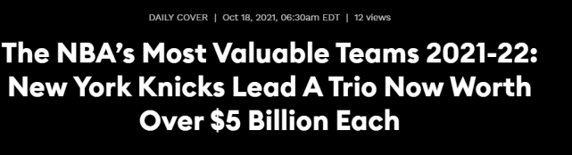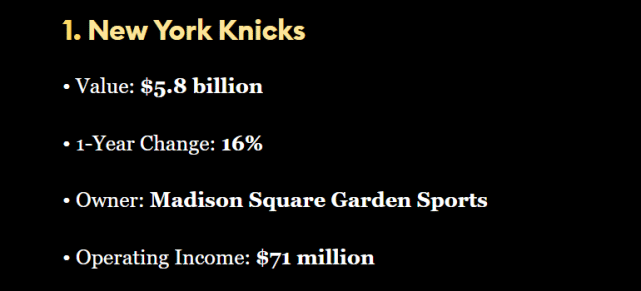 福布斯公布球队市值榜!尼克斯58亿美元领跑,勇士第二湖人第三