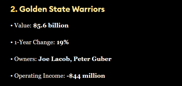 勇士的市值达到56亿美元,位居第二,过去一年增幅19%。近两年都无缘季后赛的勇士,市值依然明显增长,新建的球馆大通中心成为勇士市值增加的关键因素。不过,上赛季勇士的运营没有赚钱,福布斯数据显示,勇士过去一年的运营亏损4400万美元。