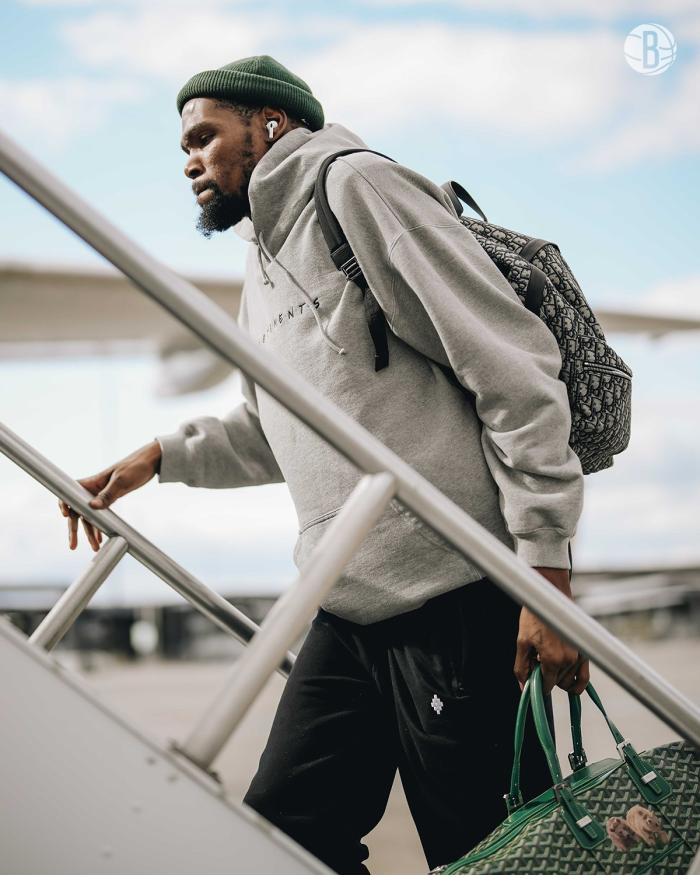 33岁杜兰特身穿黑色运动裤和灰色连帽卫衣,戴着一顶绿色针织帽,这款帽子是杜兰特最爱的;杜兰特背着双肩包,还提着一提绿色的手提包,听着音乐登上飞机,他的表情十分严肃,揭幕战对阵雄鹿,将是他的复仇之战。