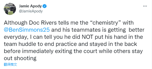 据NBA记者JamieApody报道,尽管76人主教练道格-里弗斯说西蒙斯与队友之间的化学反应在一天天的变好,但是我可告诉大家今天西蒙斯并没有将手抬起参与到球队训练结束后的“TeamHuddle”(训练结束后队员们聚在一起将拳头碰在一起)中去,他只是站在外面,然后当其他人进行投篮训练时西蒙斯立刻离开了球场。