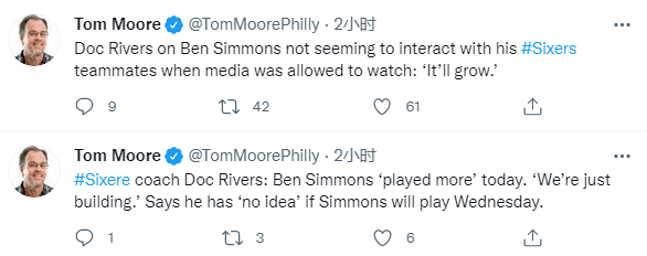 在今天的训练中,本-西蒙斯与队友的互动并不多,76人主帅里弗斯回应此事,他表示:会好起来的。他今天在训练中参与的更多了,球队正在一天天的变好,目前还不确定他是否会出战周四的揭幕战。