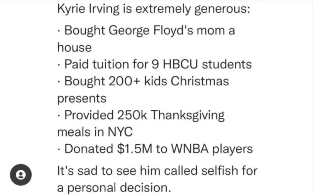 该媒体写道:“欧文非常慷慨:1. 他给乔治-弗洛伊德(美国遇害黑人)的母亲买了一套房子;2.他为9位HBCU的学生支付了学费;3. 他为超过200位孩子买了圣诞礼物;4. 他在感恩节为纽约地区捐赠了25万份餐食;5.他为WNBA球员捐款150万美元。很难过看到欧文因为一个‘个人决定’被称为自私。”