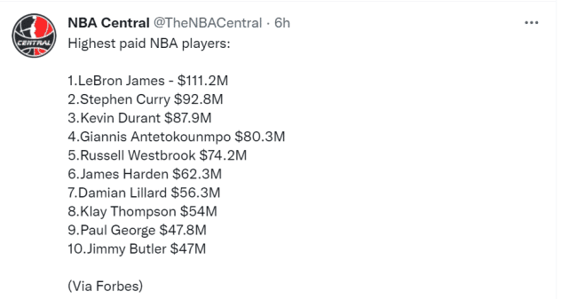 NBA球员年收入排名出炉!詹姆斯超1.1亿居首,库里第二杜兰特第三