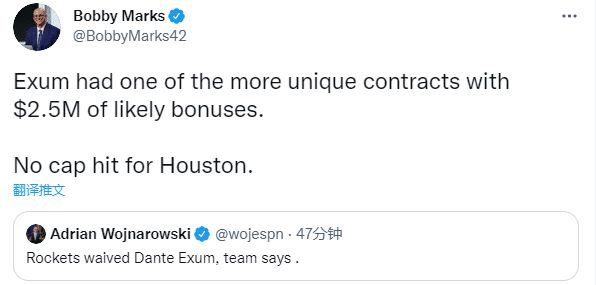 薪资专家Bobby Marks跟进报道,艾克萨姆的合同中可能包含250万美元的奖金条款,火箭没有工资帽;在2020-21赛季常规赛,埃克萨姆代表骑士共上场6次,场均上场19.3分钟,得到3.7分2.8篮板2.2助攻0.7抢断;重返火箭后,出战三场季前赛,场均上场13.7分钟仅拿到2分2篮板2.7助攻。
