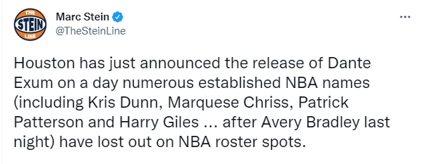 由于季前赛结束新赛季旧将开打,联盟30支球队都纷纷裁员,名记Marc Stein感慨布拉德利、邓恩等多名球员失业,发推写道:火箭已经宣布裁掉艾克萨姆,今天还有克里斯-邓恩、马奎斯-克里斯、帕特里克-帕特森以及昨天的布拉德利都在NBA失去了位置。