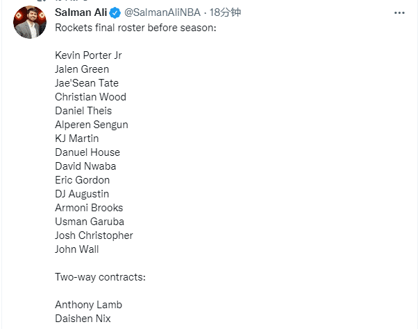 火箭队新赛季15+2阵容名单也确定下来,他们分别是小凯文-波特,杰伦-格林、泰特、伍德、泰斯、申京、小肯扬-马丁、豪斯、努瓦巴、戈登、DJ-奥古斯汀、阿尔莫尼-布鲁克斯、加鲁巴、约翰-沃尔、克里斯托弗;双向合同球员是安东尼-兰姆和戴申-尼克斯。
