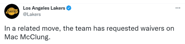 伴随这笔操作的是湖人裁掉了22岁的后卫麦克朗。麦克朗为湖人打了3场季前赛,他的场均出场时间只有5.4分钟,是全队最少的,场均只得到1.3分,投篮命中率14.3%。