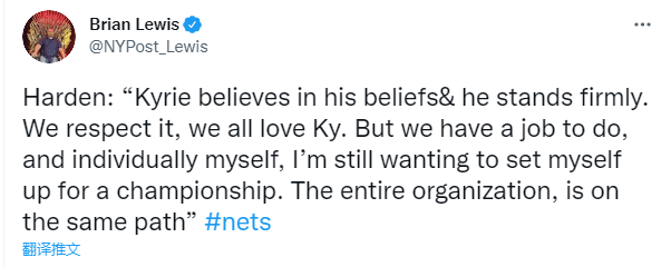 对于欧文拒绝接种被篮网禁止参加训练和比赛,哈登表示:欧文相信他的信念,他坚定不移。我们尊重它,我们都爱凯里;但我们有工作要做,就我个人而言,我仍然想为总冠军做好准备,和整个球队都在同一条道路上。