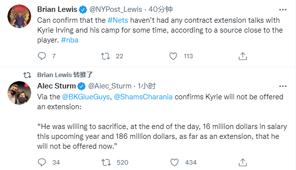 据shams等名记联合报道,篮网不会给欧文提供提前续约合同:归根结底,欧文愿意牺牲1600万美元的薪水和4年1.86亿美元的续约合同;记者Brian Lewis报道,据一位与欧文关系密切的消息人士透露,篮网已经有一段时间没有与欧文及其团队进行续约谈判了。