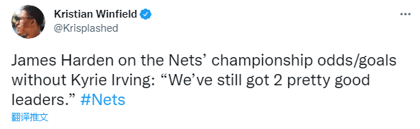 谈到没有欧文篮网仍旧是夺冠热门,哈登表示:我们仍旧有两位非常好的领袖。