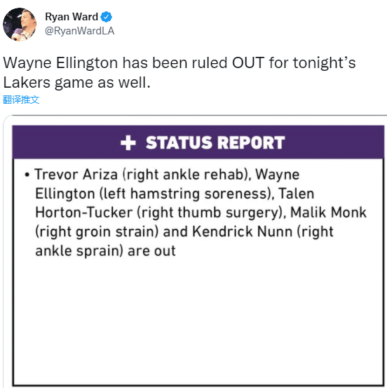 24直播网10月13日讯 湖人对阵勇士的伤情再次更新,除了阿里扎(右脚踝手术)、霍顿-塔克(右手拇指韧带撕裂)、蒙克(腹股沟拉伤)和纳恩(右脚踝扭伤)伤停之外,神射艾灵顿也伤了,因左腿筋酸痛而缺席比赛;三巨头首秀之夜,全队多达5名伤员真是太难了。