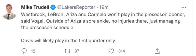不过,季前赛就是季前赛,沃格尔和湖人教练组显然是有所考虑,不想在这样的比赛中过分投入。此前,沃格尔就曾表示球队大概只会安排两场季前赛让所有主要轮换球员都登场,目前来看,对篮网一战并不在这两场计划内。