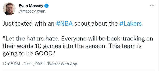 NBA记者Evan Massey在社媒上透露,一个NBA球探刚刚在短信里对他说“让黑子们黑吧。新赛季打了10场球后,每一个人都会收回他们的话。这支球队(湖人)将会表现得很出色。”