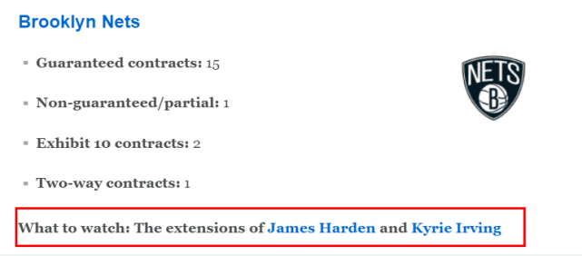 北京时间9月29日,ESPN列出了30支球队的训练营最大悬念。谈到篮网时,他们的悬念就是哈登和欧文的续约问题。