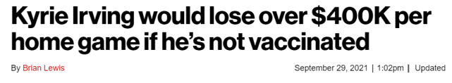纽约有防疫规定,如果欧文不接种疫苗,他不能参加篮网的主场有比赛。篮网记者表示,欧文每缺席一场比赛,就要损失大约40万美元。