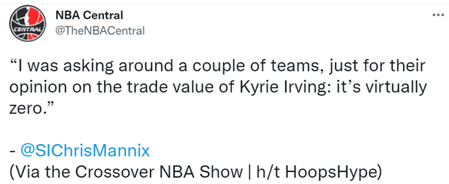 24直播网9月30日讯 ,据《体育画报》记者Chris Mannix的报道,凯里-欧文的交易价值基本是零。“我问了几支球队,就是看看他们认为欧文的交易价值有多少:基本上是零。他的新赛季薪水3500万美元,并且他非常难以捉摸。”