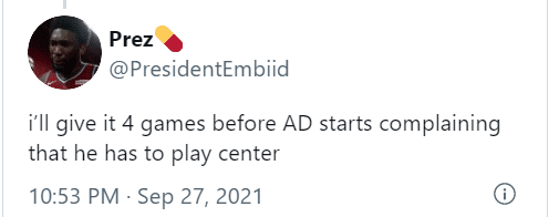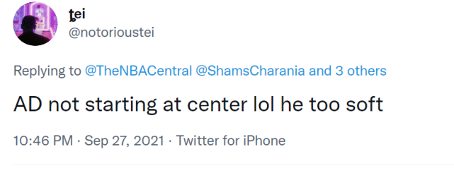 有球迷写道:“浓眉不应该打首发中锋,因为他太软了。”还有球迷写道:“大概4场比赛后,浓眉就会开始抱怨打中锋了。”