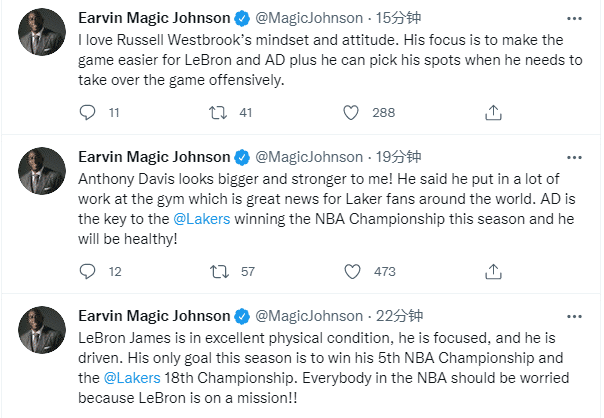 24直播网9月29日讯 湖人正式举办新赛季媒体日,詹姆斯、浓眉和威少等球员集体拍摄定妆照,三巨头正式亮相,新赛季带队冲击总冠军。对于湖人全新的冲冠阵容,湖人名宿魔术师发推说了很多话,盛赞湖人三巨头,直言湖人是全联盟最好且最聪明的球队。