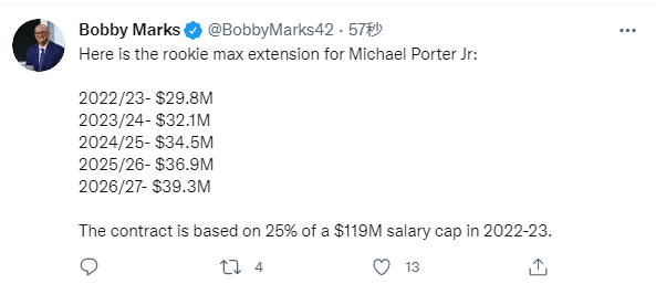之后薪资专家BobbyMarks透露小波特新合同细节是,22-23赛季2980万美元,23-24赛季3210万美元,24-25赛季3450万美元,25-26赛季3690万美元和26-27赛季3930万美元。