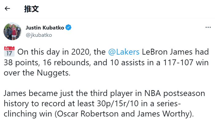 值得一提的是,詹姆斯当时也成为了NBA历史上第三位能够在系列赛晋级战中得到至少30分15篮板10助攻的球星,比肩大O罗伯特森和湖人名宿詹姆斯沃西。