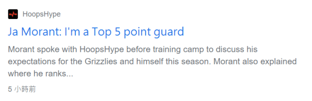 谈到自己在当今联盟控卫中的排名时,莫兰特给出的答案是“前五”。当被问及其他四人是谁时,莫兰特说:“库里。我还是保罗的狂热粉丝,另外两个是利拉德和威斯布鲁克。控卫这个位置上的人才太多了,有些人会被遗漏。”