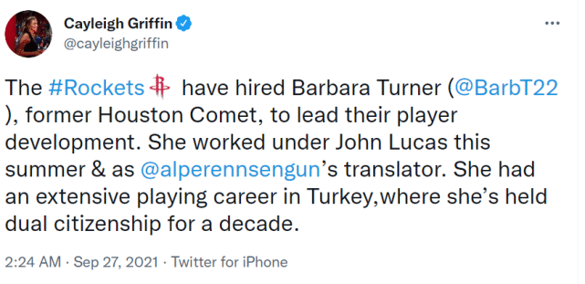 除了训练营名单,火箭官方还宣布了一项任命,他们已经聘用芭芭拉-特纳担任球队发展教练,今年夏天,特纳就已经在约翰-卢卡斯身边工作,并担任新秀申根的翻译。这位女助教曾经在土耳其打过球,目前拥有土耳其和美国的双重国籍。球员时期的芭芭拉-特纳还曾经在WNBA的休斯顿彗星队效力。