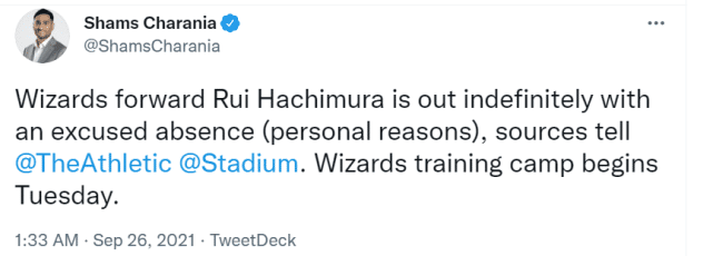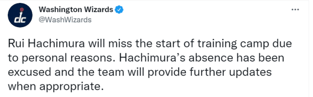 24直播网9月26日讯 ,据名记查拉尼亚报道,多方消息透露,奇才前锋八村垒因个人原因将无限期缺阵,奇才官方也更新消息,八村垒至少缺席训练营初期阶段,并表示在适当时候会更新他的动态。至于八村垒缺席的具体原因,并未被透露。