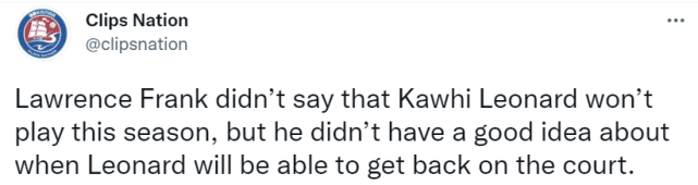 新赛季,小卡因伤预计将缺席大量比赛,至于何时复出,快船方面也没有定论。快船高管弗兰克表示,莱昂纳德会在医疗团队的帮助下努力康复,但目前没有复出的时间表。由于小卡有可能会赛季报销,他也没有进入ESPN新赛季的百大球星排名,而上赛季,他在这个榜单上高居第5位。