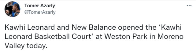 来源:24直播网09-26 14:3924直播网9月26日讯 ,据NBA记者Tomer Azarly报道,位于加州莫雷诺谷韦斯顿公园的莱昂纳德球场今日正式揭幕,快船球星科怀-莱昂纳德本人来到现场,照片上,他咧嘴大笑,心情很不错。