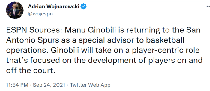吉诺比利生涯场均13.3分3.5篮板3.8助攻,两次入选全明星,两次入选最佳阵容,曾在2007-08赛季当选最佳第六人。一周前,吉诺比利曾重返马刺球馆,晒出了马刺球馆的两张内景。一张搞笑配文写道:“我觉得自己来过这里。”另一张标注了自己退役球衣的位置,写道:“我也喜欢这个角度。”