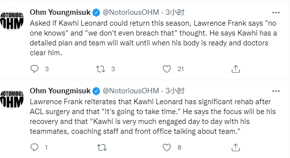对于莱昂纳德何时能够复出,快船总裁表示没有人知道小卡本赛季能否复出,我们甚至不会去谈论这个话题,他和一个很棒的团队有着非常详细的计划,我们会看看他的身体恢复情况以及医生的建议来告诉我们什么时候适合复出。