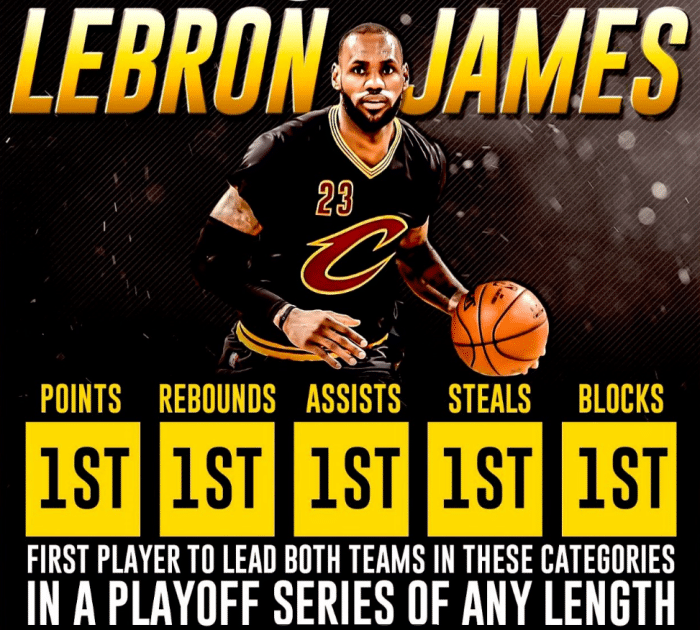 值得一提的是,勒布朗还曾在2016年总决赛创造一项神迹,得分、篮板、助攻、抢断以及盖帽全部排在两支球队榜首,这是一个前无古人也很可能后无来者的纪录。可以看到,无论是常规赛、季后赛还是总决赛,有关数据方面,詹姆斯总是走在历史前列。