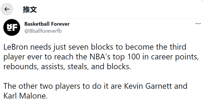 来源:24直播网09-24 11:2924直播网9月24日讯 ,据美媒Basketball Forever报道,湖人球星勒布朗詹姆斯只差7次封盖,就可以成为NBA常规赛历史第三位在得分、篮板、助攻、抢断以及盖帽这5项主要数据全部位列历史前100的球员。目前历史上只有两名巨星做到这一点,分别是卡尔马龙和加内特。