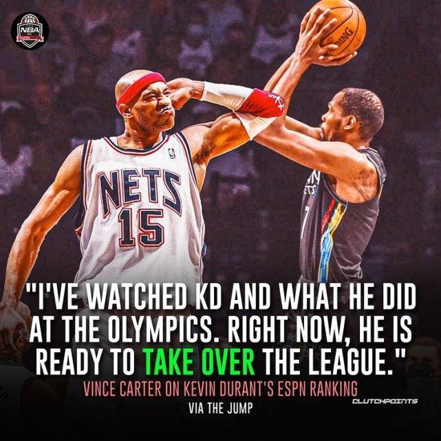 前NBA球星文斯-卡特在The Jump节目中表明了自己的态度,他认为杜兰特应该成为2021-22赛季的联盟第一巨星。“我看了KD在奥运会上的表现,现在,他已经做好准备接管这个联盟了。”你们认同卡特的说法吗?在你心中,新赛季前五的排序是什么样的?欢迎留言发表见解。