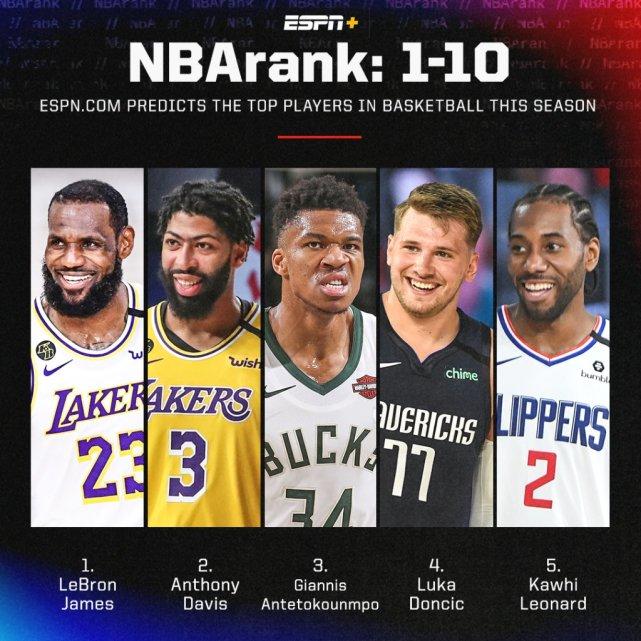 可能这时候有球迷会好奇,上赛季开始前,ESPN评选百大球员的前五位分别是谁呢?当时前五位依次是詹姆斯、浓眉、字母哥、东契奇和小卡。杜兰特排在第六位,库里排在第八位。一年前的前五位,已经有两人不在今年的行列中。