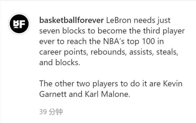 新赛季,詹姆斯将创造多项里程碑,他的总得分有望超越马龙,升至第二,他的罚球和出场时间也有望创造新高。美媒今天还晒出了他的又一项里程碑:还差7个盖帽,就能成为第三位生涯总得分、篮板、助攻、抢断和盖帽都进入历史前100位的球员。此前两位做到的球星是卡尔-马龙和加内特。