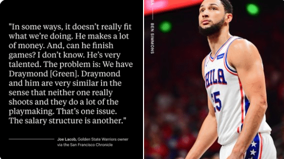 目前西蒙斯和76人之间的关系十分糟糕,西蒙斯铁了心要离队,不仅表态不想继续搭档恩比德,而且表示离队前不会再穿NBA球衣,在这样的情况下,勇士老板拉科布惹事了,因贬低西蒙斯被联盟罚款5万美元,这相当于是拉科布净资产的0.000003%。