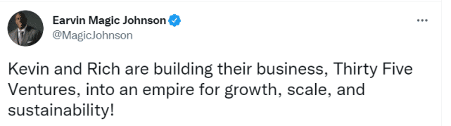 魔术师在自己和杜兰特、克莱曼的三人合影下配文写道:“凯文(杜兰特)和里奇(克莱曼)正在把他们的‘Thirt Five Ventures’打造成一个颇具规模,且稳定发展的商业帝国。”