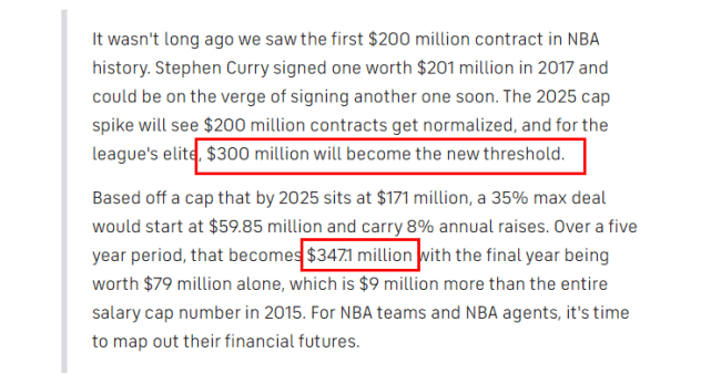 福布斯记者莫特-詹森表示:“并不是很久以前,我们看到NBA历史上的第一份2亿美元合同,库里在2017年签下了2.01亿合同,现在又签了一份新的超2亿合同。2025年的工资帽飙升,将让2亿美元合同变得更普遍,对于联盟的精英球员来说,3亿美元合同成为新的门槛。”