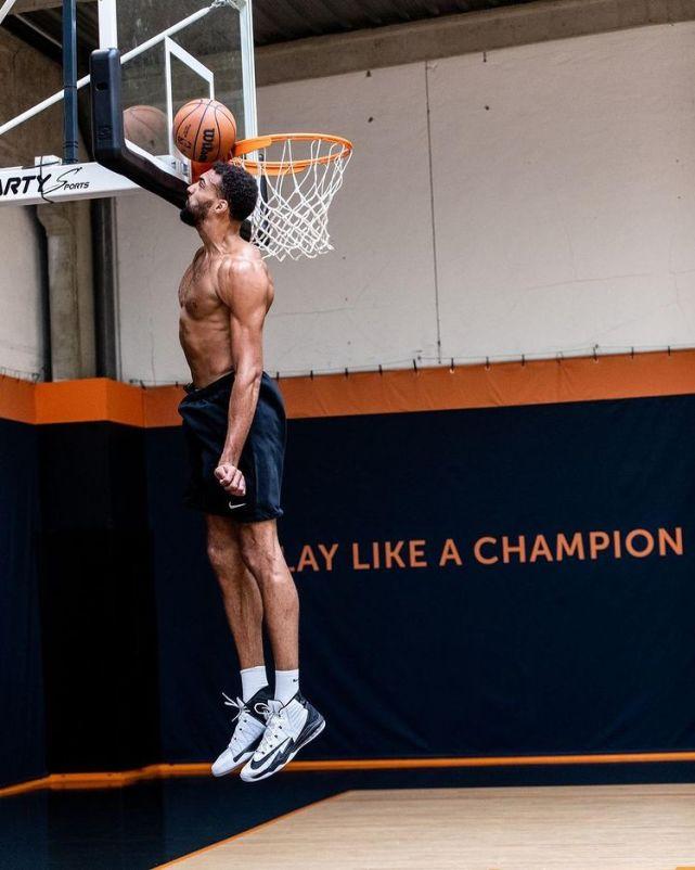 2020-21赛季,戈贝尔场均14.3分13.5篮板2.7盖帽,投篮命中率67.5%,是所有符合排名标准的球员里命中率最高的。过去四个赛季,戈贝尔三次当选年度最佳防守球员,他在防守端的威胁,确实能让对手心生畏惧。一次训练中,戈贝尔还秀了把弹跳,用头把卡在篮脖子上的球顶了下来。