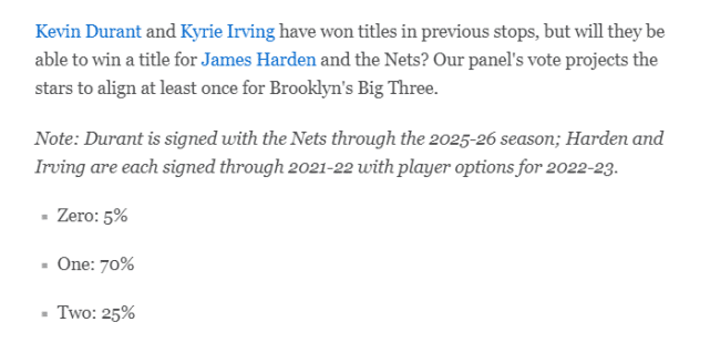 第四个投票话题是杜兰特、哈登和欧文联手时期的篮网,能拿几个冠军?5%的专家给出的答案是零个,70%的专家选择一个,25%的专家选择两个。换句话说,95%的专家看好三巨头时期的篮网,至少能拿到一个冠军。篮网被视为新赛季夺冠的头号热门,他们能在2021-22赛季就完成一个夺冠指标吗?