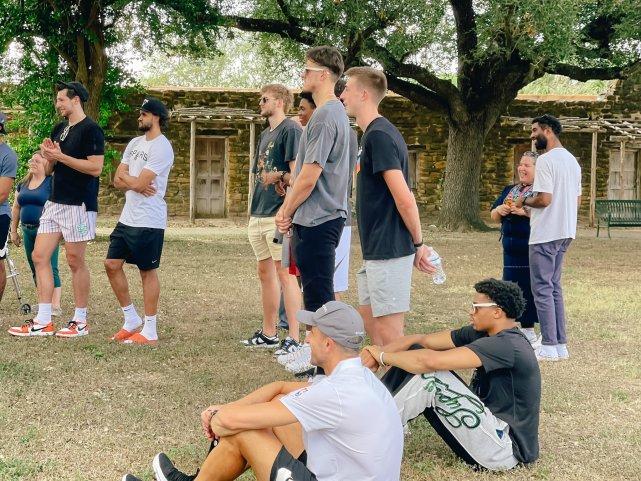 吉诺比利为啥突然出现在马刺球馆呢?原来,他最近在执行马刺委派给他的一项任务,带着队内的年轻人逛逛圣安东尼奥,了解这里的风土人情。