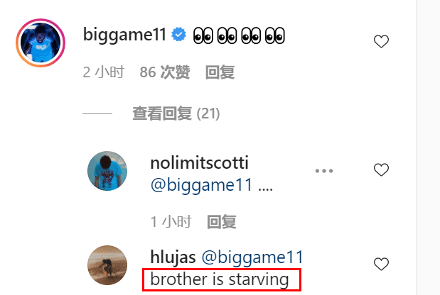 恩尼斯关注了湖人的官方社媒,每一次湖人官方晒照片或视频,恩尼斯几乎都会去点赞,还时不时在评论区里冒个泡。他的出现频率,不逊于任何湖人球员,仿佛自己已经是这支球队中的一员。湖人官方今天晒出詹姆斯和威少的合练视频时,恩尼斯又评论了,一个球迷回复他:“兄弟饥渴难耐。”