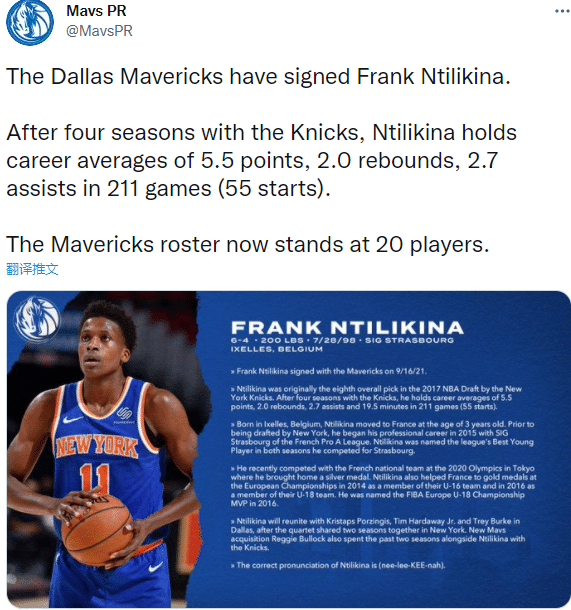 弗兰克-尼利基纳是17年首轮8号秀,进入联盟前四个赛季都为尼克斯队效力,总共出战 211 场比赛(55 场首发),场均上场19.5分钟拿到5.5 分、2.0 个篮板和 2.7 次助攻;今年休赛期,尼利基纳的4年1869万美元新秀合同到期,尼克斯没有为他开出资质报价,最终以自由球员的身份加盟独行侠。