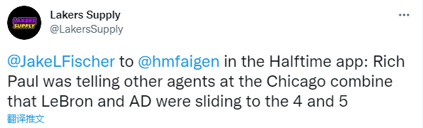 来源:24直播网09-16 10:5524直播网9月16日讯 ,湖人两大巨头詹姆斯和浓眉新赛季的位置曝光,据NBA记者JakeFischer报道,关于湖人首发阵容,他们的经纪人里奇-保罗在芝加哥联合试训期间告诉其他经纪人,詹姆斯将改打四号位,戴维斯会改打五号位。