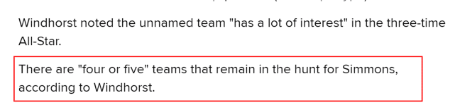 The Athletic报道,国王曾和76人谈过在西蒙斯的交易,但国王认为76人的要价太高,不愿意付出队内的福克斯或者哈利伯顿。勇士也曾和76人有过交流,双方并没有找到一个能让彼此接受的现实报价。名记马克-斯坦恩报道,骑士是另一支对西蒙斯感兴趣的球队。