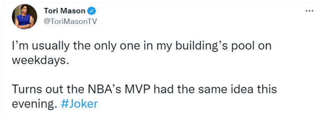 来源:24直播网09-02 15:2924直播网9月02日讯 ,丹佛CBS电视台女主播Tori Mason更新社媒,晒出了一张自己和约基奇的合影。她配文写道:“通常周末的泳池里只有我自己,看来NBA的MVP今晚也有同样的想法。Joker(小丑,约基奇的绰号)”