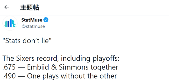 数据确实没有说谎。事实上,当西蒙斯和恩比德一同出战时,球队的胜率高达67.5%,而两人中仅一人出战比赛时,费城胜率只有49%,差距一目了然。